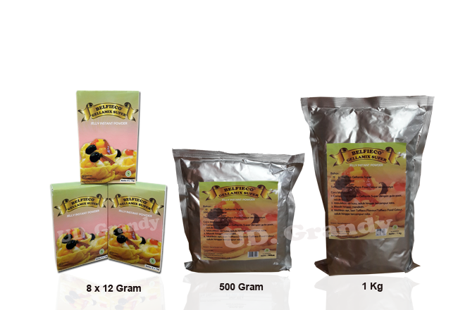 Belfieco Gellamix Super Published July 2, 2015 | By orangbaik Dapat digunakan : Pudding, aneka hidangan penutup, pie, dekorasi kue, soft pudding, dll Kemasan Satuan : 8 x 12 gram, 500 gram, 1kg Kemasan Karton : 24 pcs @ 8 x 12 gram, 6 pcs @ 1kg
